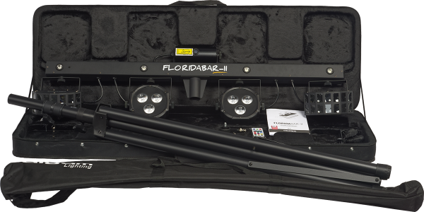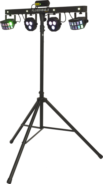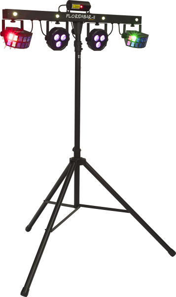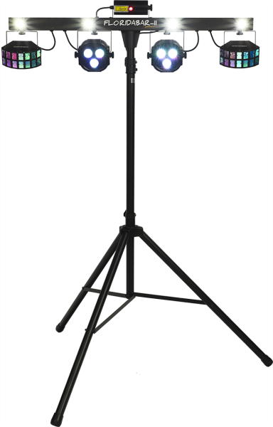 The Florida Bar II is a 4-in-1 lighting system that provides a powerful entertainment solution for DJs, mobile discos, bands, and private events. Comprising two RGB LED PARs and two stunning Derby effect projectors, the Florida Bar II also features an RGB laser and a strobe effect powered by four white LEDs for impressive performances. This complete system sets up in just a few moments on its sturdy telescopic tripod, reducing setup time to a minimum.