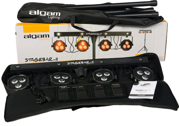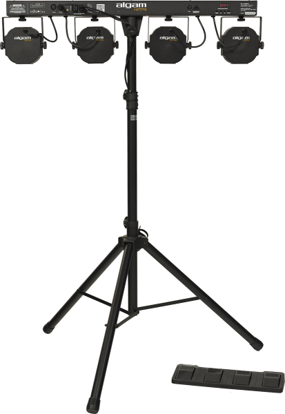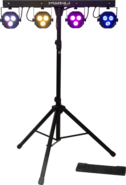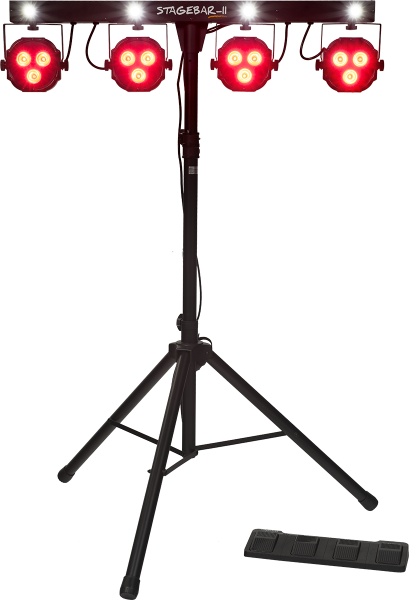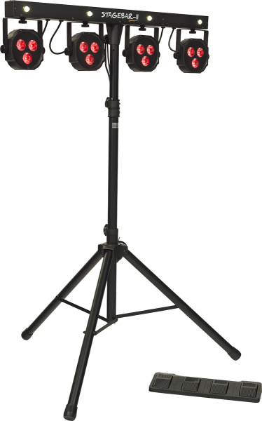 The Stagebar II is an all-in-one LED lighting system that provides an ideal lighting and entertainment solution for DJs, mobile discos, and bands. Comprising 4 RGB LED PARs topped with 4 white LEDs for the strobe effect, this complete system sets up in just a few moments on its sturdy telescopic tripod, minimizing setup time during your performances. Its various operating modes, such as music recognition with a built-in microphone, as well as its wireless footswitch for foot control, make it a complete package ideal for the stage.