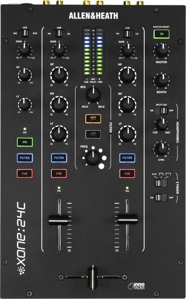 The Xone:24C is a 2+1 channel hybrid DJ mixer that blends the warmth of a pure analog signal path with the flexibility of modern digital connectivity. Compact and versatile, it’s ideal for home studios, intimate clubs, or mobile setups. Its USB-C audio interface and powered hub make it easy to integrate with streaming platforms, DVS systems, or your DAW.