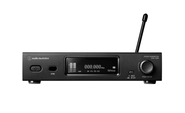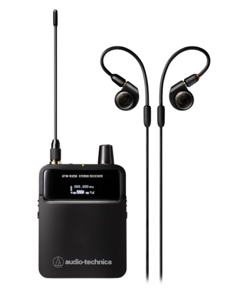 This system includes a rack-mount transmitter with an OLED display and front-panel controls, a portable bodypack receiver with an integrated headphone amplifier, and ATH-E40 in-ear monitors with dual-phase push-pull technology.