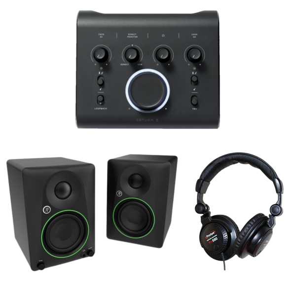 The Saturn II is a compact, elegant USB audio interface from Carver Pro, designed for demanding musicians and designers. It comes with closed studio headphones (Prodipe PRO580) and a pair of speakers (Mackie CR4.5).
