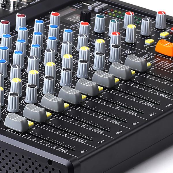 - 2 stereo inputs with gain control, signal indicator light, 3-band tone controls, left and right audio and video distribution, aux send, and effects send. The other two stereo inputs feature volume control, signal indicator, and aux send button. - Bluetooth Receiver: V5.1 + BR + EDR + BLE