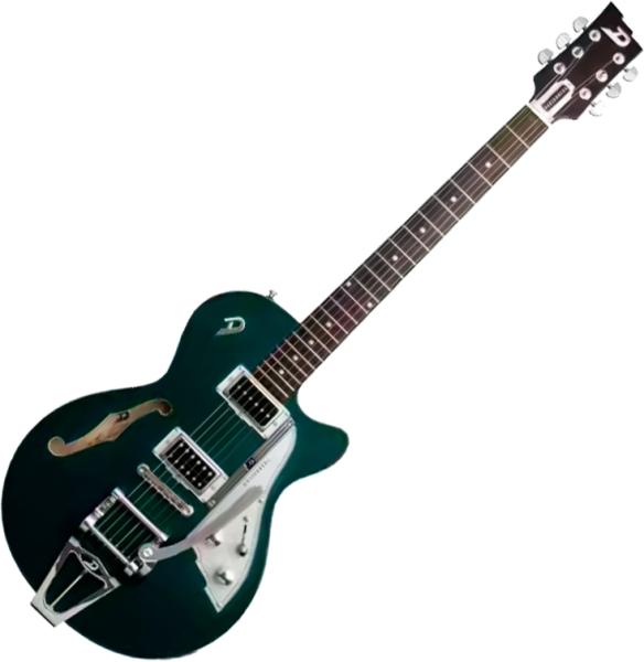 The DUESENBERG Starplayer CBR (Catalina Green) semi-hollow body electric guitar (with internal sustain bloc), is constructed the same way as regular Starplayer TV (semi-hollowbody, dual pickup, 22 fret electric guitar) but now with a Mahogany body and figured Maple top.