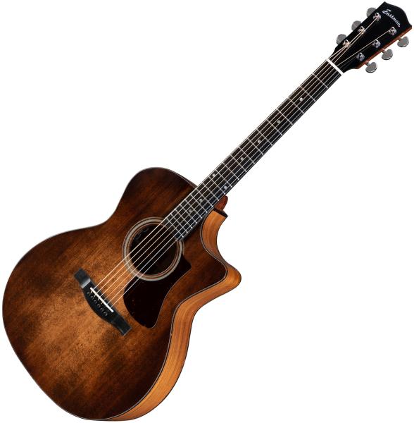 EASTMAN Truetone Satin AC222 CE (Classic) est une folk électro-acoustique de style) is a Grand Auditorium cutaway acoustic/electric guitar with solid Sitka Spruce top, solid Ovangkol back/sides, Mahogany neck, Ebony fingerboard and Fishman Sonitone preamp (volume and tone controls inside soundhole).