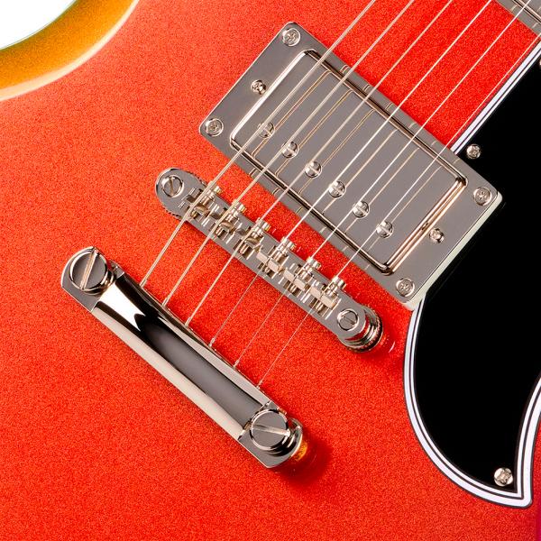 The double-cutaway mahogany body features classic SG sculpted edges that not only look great but also make it very comfortable to hold and play. The glued-in mahogany neck features an ultra-comfortable, fast-playing Modern C profile and is topped with a bound ebony fretboard with 22 stainless steel medium jumbo frets and classic Super 400-style pearloid split-block inlays. The fretboard also features a 10”-14” compound radius, making chording and string bends smooth and effortless.