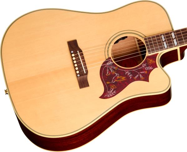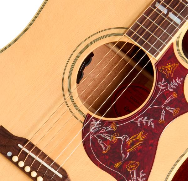 The mahogany neck is joined to the body with a glued-in tapered dovetail neck-to-body joint and features a Rounded C profile that ensures comfortable playability. The neck is topped with a bound rosewood fretboard equipped with 20 standard frets and dressed up with the classic split parallelogram inlays that are one of the hallmarks of the Hummingbird design. The other ends of the strings are routed over a compensated plastic saddle and are anchored to the belly-up rosewood bridge with ivory-colored bridge pins.