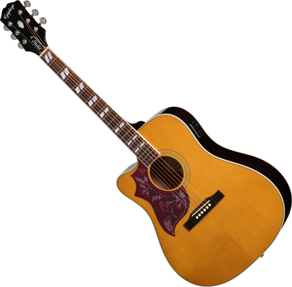 The Hummingbird Studio EC features a layered mahogany body with six-ply antique ivory and black binding on the top and four-ply antique ivory and black binding on the back, complemented by a solid spruce top for a responsive, balanced tone with excellent dynamic range that will sound even better as it ages. The mahogany neck is joined to the body with a glued-in tapered dovetail neck-to-body joint and features a Rounded C profile that ensures comfortable playability. The neck is capped with a bound rosewood fretboard equipped with 20 standard frets and adorned with the classic split parallelogram inlays that are one of the hallmarks of the Hummingbird design. The other ends of the strings run over a compensated plastic saddle and anchor to the belly-up rosewood bridge with ivory-colored bridge pins. Other details that give the Hummingbird Studio EC even more vintage-style visual appeal are also included, such as a Hummingbird tortoise shell-colored pickguard with iconic Hummingbird graphics, high-quality Grover® Rotomatic® tuners for precise and stable tuning, and a 60s Kalamazoo-style headstock with the Epiphone logo and Gibson Crown prominently inlaid in mother of pearl. The Hummingbird Studio EC is equipped with Fishman™ electronics, including an S-Core under-saddle pickup and Fishman Presys II preamp with side-mounted volume, bass, treble, and phase controls. It also has a convenient built-in electronic tuner, making it quick and easy to get tuned up. The Epiphone Hummingbird Studio EC has a gloss finish and is offered in two vintage-inspired colors—Natural and Heritage Cherry Sunburst. Both right and left-handed versions are available. A standard gig bag is also included.
