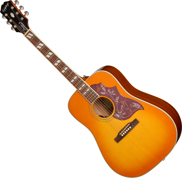 The EPIPHONE Inspired by Gibson Hummingbird Studio Left Handed (EASHBHCNH1L) is part of the Epiphone Studio Acoustic Collection. These guitars have been completely reimagined to offer the most authentic and affordable acoustic guitars inspired by iconic Gibson designs. The Hummingbird Studio offers a blend of classic design and modern functionality and was designed to appeal equally to beginners and seasoned players alike. Based on the iconic Gibson Hummingbird acoustic guitar that has been embraced by players across a wide range of musical genres, the Hummingbird Studio has a square shoulder dreadnought body and 24.75” scale length, just like the Gibson guitar that inspired it. The Hummingbird Studio delivers a rich, balanced tone with excellent projection, making it an ideal choice, no matter which musical styles you want to explore. The Hummingbird Studio has a layered mahogany body with six-ply antique ivory and black binding on the top, four-ply antique ivory and black binding on the back, and a solid spruce top for a responsive, balanced tone with excellent dynamic range that will sound even better as it ages. The mahogany neck is joined to the body with a glued-in tapered dovetail neck-to-body joint and features a Rounded C profile that ensures comfortable playability. The neck is topped with a bound rosewood fretboard equipped with 20 standard frets and dressed up with the classic split parallelogram inlays that are one of the hallmarks of the Hummingbird design. The other ends of the strings are routed over a compensated plastic saddle and are anchored to the belly-up rosewood bridge with ivory-colored bridge pins. We also included other details that give the Hummingbird Studio even more vintage-style visual appeal, including a Hummingbird tortoise shell-colored pickguard with the iconic Hummingbird graphics, high-quality Grover® Rotomatic® tuners for precise and stable tuning, and a 60s Kalamazoo-style headstock with the Epiphone logo and Gibson Crown proudly inlaid in mother of pearl. The Hummingbird Studio comes with Fishman electronics, including an S-Core under-saddle pickup and Fishman™ Presys VT preamp with soundhole-mounted volume and tone controls that are fast and easy to access for the player while remaining nearly invisible to the audience. The Epiphone Hummingbird Studio has a gloss finish and is offered in two vintage-inspired colors—Antique Natural and Heritage Cherry Sunburst. Both right and left-handed versions are available. A standard gig bag is also included.
