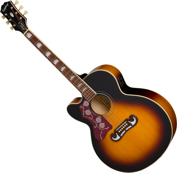 Are included other details that give the J-200 Studio even more vintage-style visual appeal, including a classic J-200 style tortoise shell-colored pickguard with the legendary two-color J-200 graphics, Epiphone Deluxe tuners with Keystone buttons, and a bound 60s Kalamazoo-style headstock with the Epiphone logo and Gibson Crown proudly displayed in mother of pearl. The J-200 Studio comes with Fishman® electronics, including an S-Core under-saddle pickup and Fishman Presys II preamp.