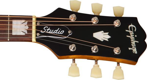 We also included other details that give the J-200 Studio even more vintage-style visual appeal, including a classic J-200 style tortoise shell-colored pickguard with the legendary two-color J-200 graphics, Epiphone Deluxe tuners with Keystone buttons, and a bound 60s Kalamazoo-style headstock with the Epiphone logo and Gibson Crown proudly displayed in mother of pearl. The J-200 Studio comes with Fishman® electronics, including an S-Core under-saddle pickup and Fishman Presys™ VT preamp with soundhole-mounted volume and tone controls that are quick and easy to access for the player while being nearly invisible to the audience. The Epiphone J-200 Studio has a gloss finish and is offered in two vintage-inspired colors—Natural and Vintage Sunburst. Both right and left-handed versions are available. A standard gig bag is also included.
