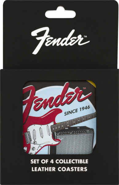 The beautiful set of four Fender leather coasters, inspired by 1946 guitars and amplifiers, is the perfect accessory for your home or office.