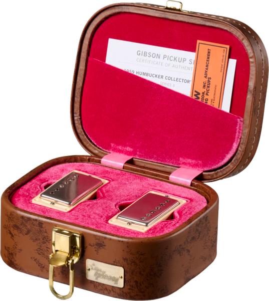 Packaged in a high-quality Lifton™ presentation case, GIBSON Collector’s Edition 1959 Humbucker Series 3 Pickup Set features Double Classic White butyrate bobbins, Alnico 3 roughcast long magnets, vintage-accurate nickel covers, and yellowed Cream M69 mounting rings, with the silver-nickel covers, baseplates, screws, and springs masterfully aged by the artisans of the Murphy Lab.