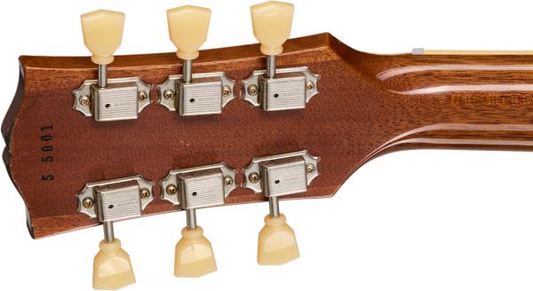 Each of these guitars features historically accurate 1955 specifications, including a lightweight one-piece mahogany body and a hide glue-fitted two-piece plain maple cap. The one-piece mahogany neck has a long neck tenon, a 1950s Chunky D-Shape neck profile, and an Indian rosewood fretboard that has 22 historic narrow/tall frets, a 12” fretboard radius, and is adorned with aged cellulose nitrate trapezoid inlays. The headstock features a period-correct “low logo” holly headstock veneer and is equipped with a nylon nut and single line, single ring Kluson® tuners, and has a historical 1955 limited run serial number on the back.