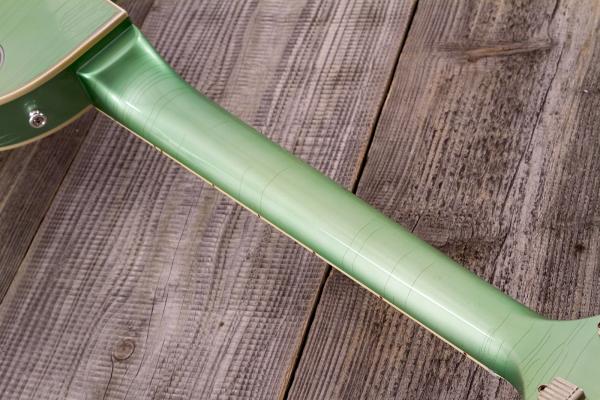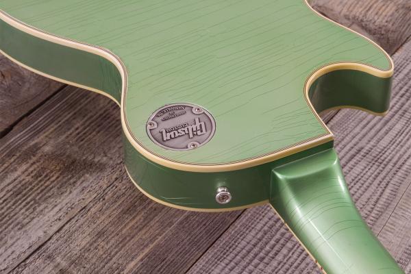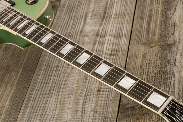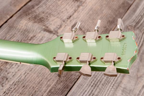 This Gibson Custom Select 1968 Les Paul Custom features a hand-mixed finish that is sourced from Oldsmobile’s catalog of finishes from 1959. Other Gibson Custom Colors from the 1960s were also sourced from this same catalog, such as Silver Mist, Polaris White, Kerry Green, and Frost Blue. There is a possibility that Gibson could have used Jade Green during the Golden Era. This finish is hand-mixed to account for the color appearing different when it is applied to sheet metal versus when it is applied to maple and mahogany. The Jade Green finish is aged by the Murphy Lab. Its Light Aging level makes the finish slightly more yellow than what is underneath the clear antique finish. The typical gold hardware on a normal Les Paul Custom is swapped for the more subtle nickel hardware. This special finish and changed hardware are features that can only be found through Gibson Custom Select and Made to Measure.