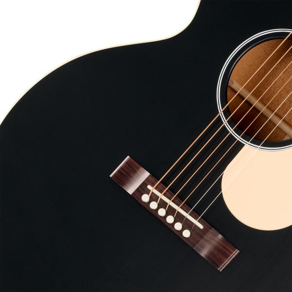 The headstock showcases open-back Golden Age strap tuners with cream buttons, along with an early-1900s Gibson script logo decal that reinforces the vintage aesthetic. Complementing these details is a sloped rectangle closed-slot rosewood bridge reminiscent of early J-45 instruments. Bone is used for both the nut and saddle, while the bridge pins are TUSQ®.