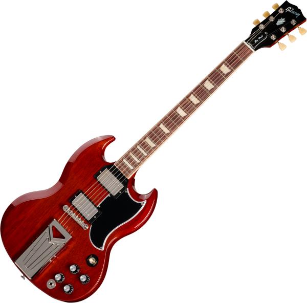 This limited-edition instrument pays tribute to the legendary ’61 SG, with its unmistakable double-cutaway silhouette and pronounced bevels that evoke generations of rock storytelling. Its SlimTaper™ neck, carved from mahogany, invites expressive playing along a rosewood fretboard fitted with 22 medium jumbo frets and accented by glowing acrylic trapezoid inlays. A Graph Tech® nut partners with Gibson Vintage Deluxe tuners with keystone buttons to deliver exceptional tuning dependability. At the other end, the strings ride across an ABR-1 Tune-O-Matic™ bridge for complete control over action At the other end, the strings ride across an ABR-1 Tune-O-Matic™ bridge for complete control over action and intonation, then anchor into a stop tailpiece concealed beneath a Sideways Vibrola™ cover. The Vibrola tailpiece has been internally modified and secured so it remains decorative rather than functional, mirroring the appearance of Jake’s own beloved 1961 SG, the Beloved, while providing the stability and performance of a fixed tailpiece. Once a tool for experimental bends and shimmering effects, the immobilized Vibrola now serves as a visual homage and a symbol of modern reliability.