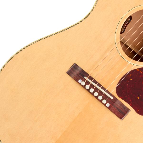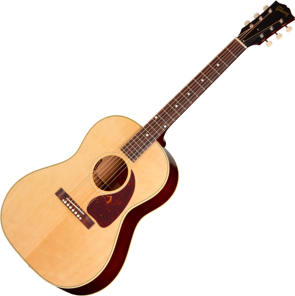 Today, Gibson proudly reintroduces this classic with the GIBSON USA Original 50s LG-2 (OCSBLGAN), a faithful tribute to the highly sought-after 1950s versions. Responding to years of demand, this model combines vintage-inspired aesthetics with exceptional craftsmanship. It features a solid Sitka spruce top supported by traditional scalloped X-bracing, paired with solid mahogany back and sides for a rich, resonant tone. The body is accented with three-ply top and single-ply back binding, while the mahogany neck sports a comfortable Rounded profile and a compound dovetail joint secured with hot hide glue. An unbound rosewood fretboard with 20 frets and mother-of-pearl dot inlays adds understated elegance. Completing the look is a sloped, rectangular rosewood bridge with two mother-of-pearl dots, bone nut and saddle, TUSQ® bridge pins, Grover® strap tuners with white buttons, and a tortoise teardrop pickguard for authentic vintage character.