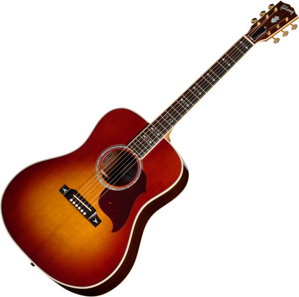 The neck has a compound dovetail joint and is attached to the body using hot hide glue for a stable connection and maximum tonal transfer. The bound headstock has a rosewood veneer that features the Gibson logo and Crown inlaid in mother-of-pearl. The nut is bone, and high-quality gold Grover® open-back tuners are fitted. The bridge is also ebony and is equipped with a bone saddle and TUSQ® bridge pins, and decorated with mother-of-pearl arrow inlays. The thermally-aged Sitka spruce top is protected by a custom line tortoise pickguard and features a wide abalone rosette.