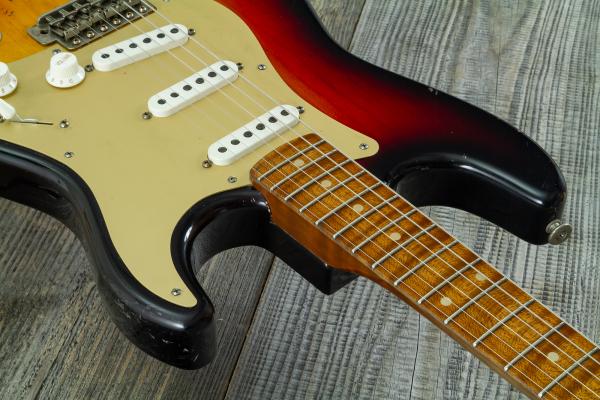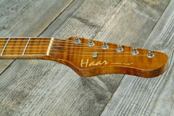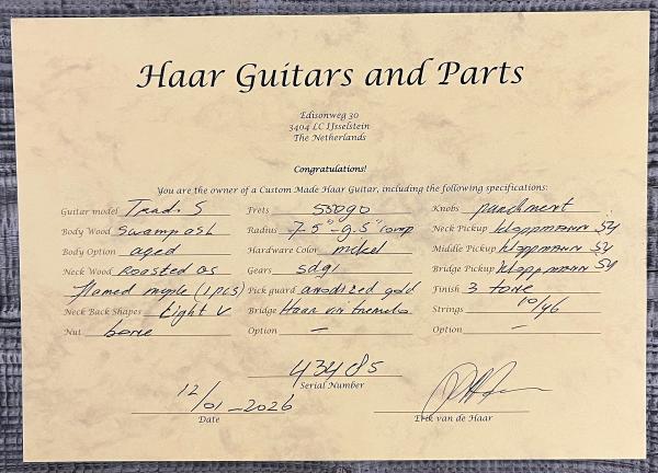 This HAAR GUITAR Trad S #43485 features a one piece Swamp Ash body, torrefied 4A figured Maple neck and fretboard (compound 7.5" / 9.5" radius) and Kloppmann '54 pickups.