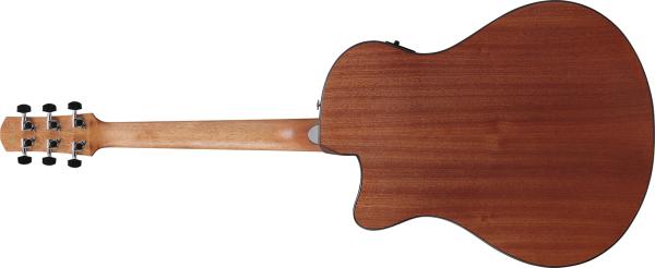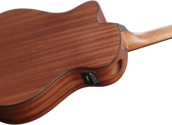IBANEZ Advanced Acoustic AAM54CE OPN is a proprietary Auditorium with cutaway acoustic/electric guitar featuring solid Sapele top, layered Sapele back/sides, Okoume neck, Purpleheart fretboard and Ibanez Custom Electronics preamp w/Onboard tuner.