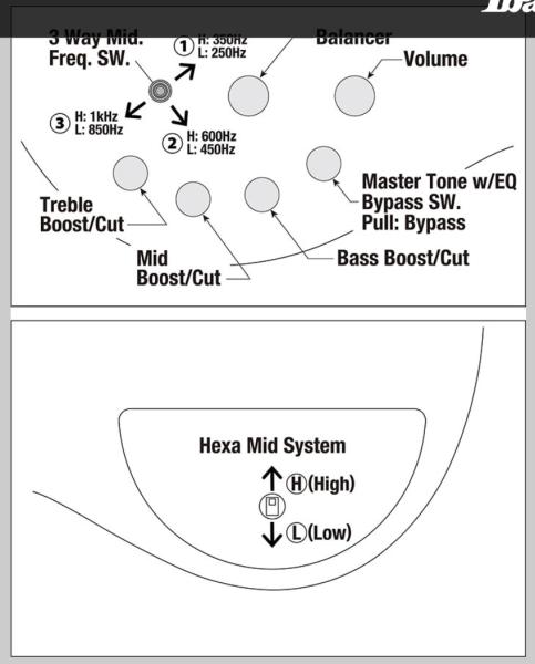 - Ibanez Sonitech Preamp 3-band EQ w/EQ bypass switch (push/pull), 3-way Mid frequency switch w/Hexa Mid system