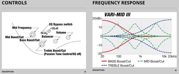 - Ibanez Vari-mid 3-band EQ w/ EQ bypass switch (passive tone control on treble pot)