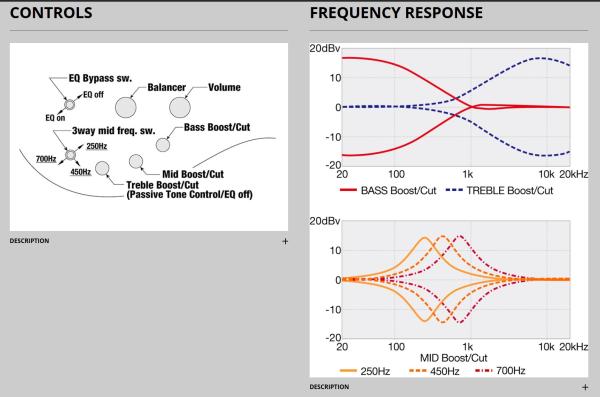 - Ibanez Custom Electronics 3-band EQ w/ EQ bypass switch (passive tone control on treble pot) & 3-way Mid frequency switch