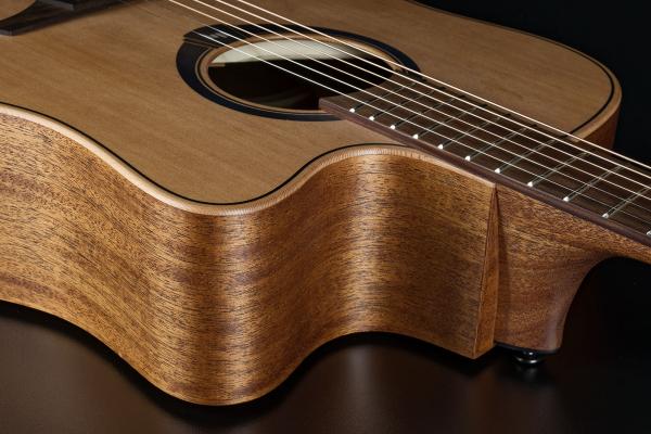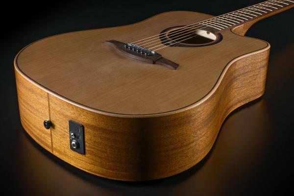 The very attractive and comfortable LAG Hyvibe HV10DCE is an Dreadnought steel string acoustic/electric guitar featuring solid Cedar top, layered Khaya back/sides/neck and Brown Brankowood fingerboard/bridge. It benefits from excellent craftmanship, and provides warm, rich and dynamic sounds.
