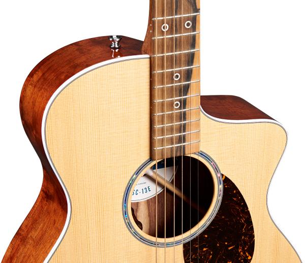 The MARTIN Road Series SC-13E Modern (Natural) acoustic/electric guitar is your road to premium tone, playability, and style. Its gloss SC body and Sure Align® neck system give you full fretboard access with electric-guitar comfort, while koa fine veneer back and sides add balanced tone with rich mids, smooth highs, and long sustain. A solid spruce top and scalloped X-bracing boost clarity and projection, and the Low Profile Velocity neck keeps every position feeling fast and effortless.