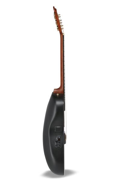 The electro-acoustic signal processing begins with an Ovation Slimline pickup at the bridge, distinguished by its narrow shape. The notched bridge increases the pressure point on the piezoelectric crystals, resulting in a particularly even tone. Before leaving the guitar, the signal is further refined by an Ovation OP4BT preamp with a 3-band EQ and a built-in tuner.