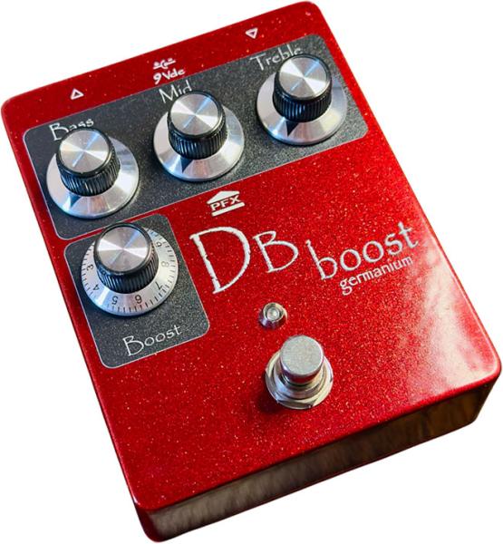 Designed and built in France, PFX CIRCUITS DB Boost compact pedal merges the sounds of Rangemaster Boost Germanium with the three band EQ of the clean channel of legendary Dumble Overdrive Special amp, notably loved by missed Stevie Ray Vaughn.