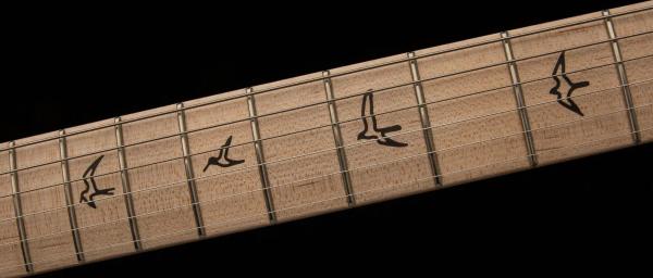The headstock shape is based on PRS’s trademark design, but inverted to both accommodate Mayer’s playing style and also to keep a consistent length of string behind the nut, which makes staying in tune easier. The tuners are a traditional vintage-style, closed-back tuner, but with PRS’s locking design.