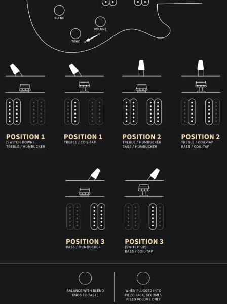 - Blend magnetic pickups / piezo (or piezo volume if piezo through dedicated output)