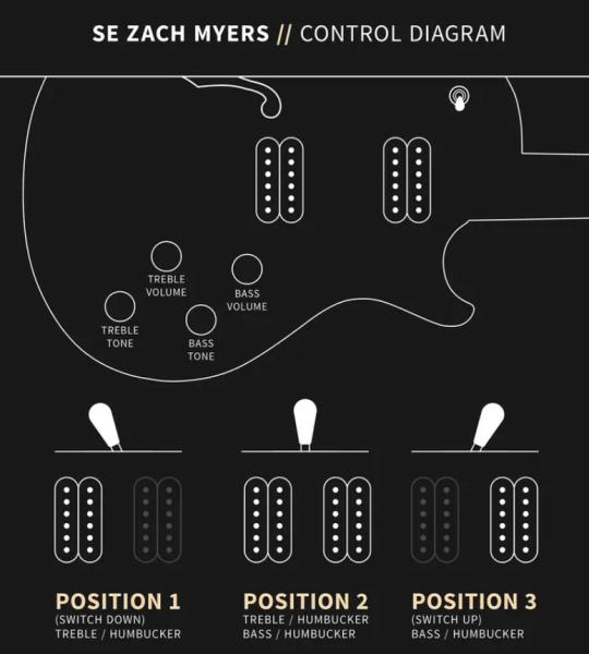 Additional appointments to the SE Zach Myers signature model include a 22-fret, 24.594” scale length neck, PRS adjustable stoptail bridge, vintage-style tuners, and PRS-designed 245 “S” pickups paired with two volume and two tone controls and a 3-way toggle pickup switch. These pickups bring high-end clarity, low-end power, and an overall aggressive punch that maintains a certain sweetness.