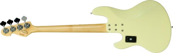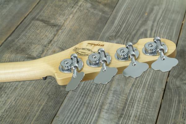 - Solid body electric bass with short scale