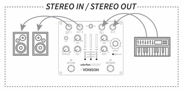 The DETUNE section delivers a wide stereo chorus by pitch-shifting the left and right channels in opposite directions. The detune amount can be dynamically modulated by the input envelope, so the stereo spread responds to your playing, ranging from gentle shimmer to dramatic detuning